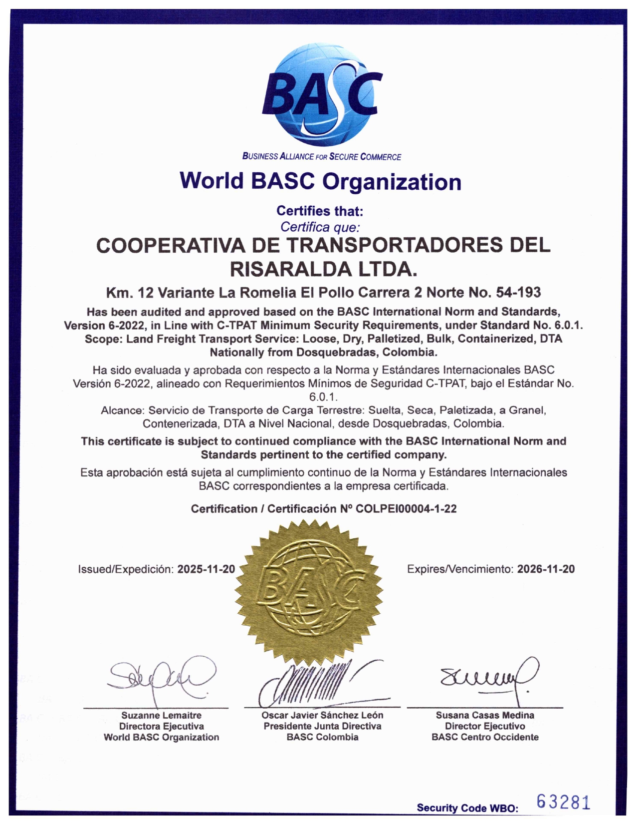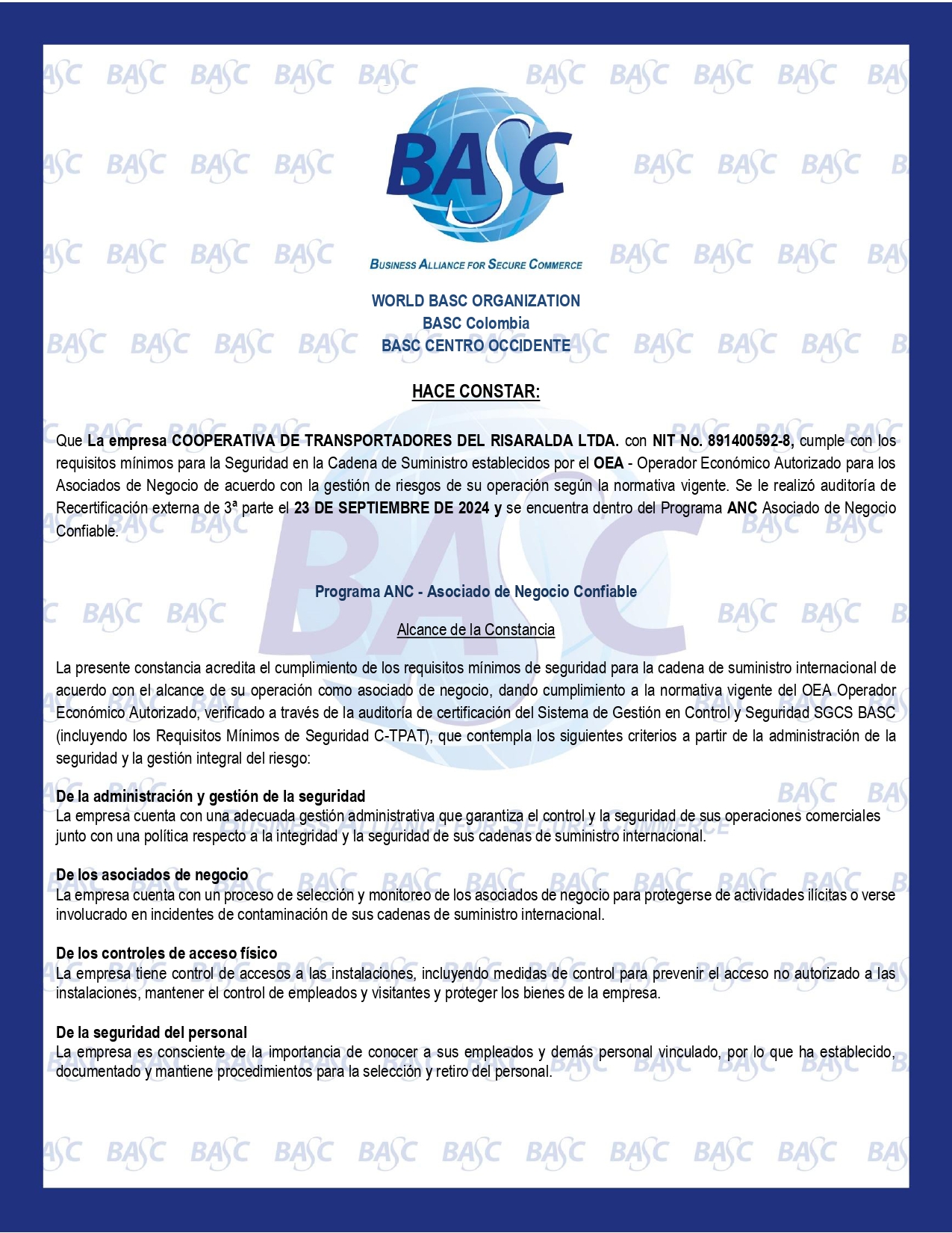 La certificación BASC es obtenida con la misión de generar cultura de seguridad a través de la cadena de suministro, mediante la implementación de sistemas de gestión e instrumentos aplicables al comercio internacional y sectores relacionados.